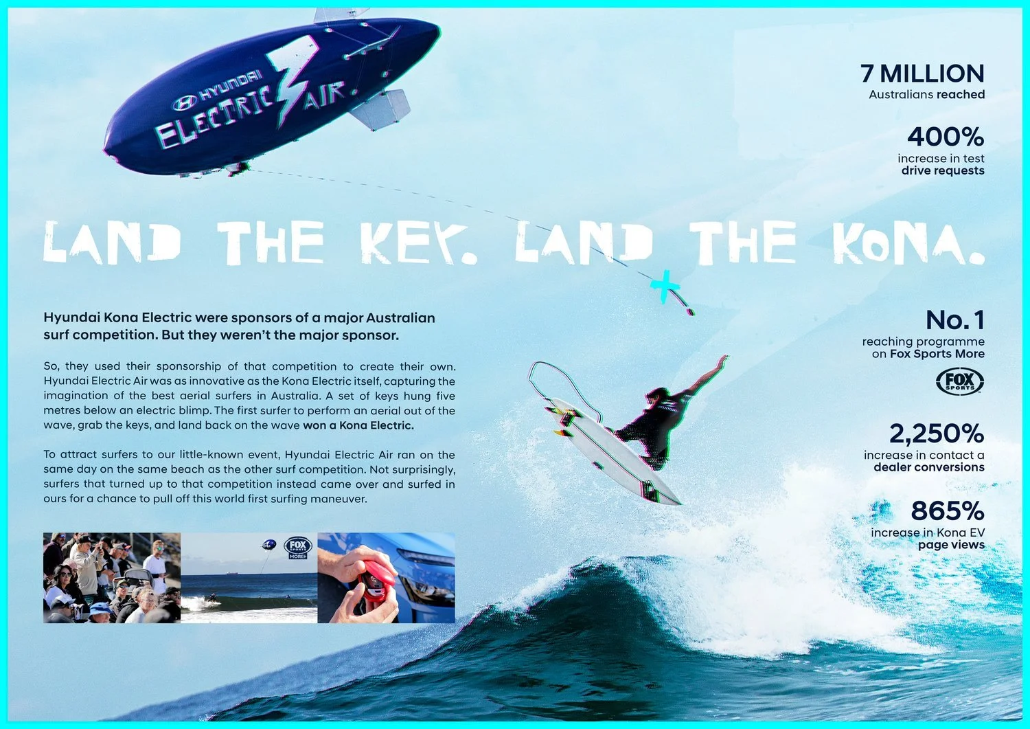 Rather than just sponsor a surf competition, Hyundai created their own. A set of keys hovered above the waves, hanging five metres below an electric blimp. The first surfer to perform an aerial out of the wave, grab the keys, and land back on the wave won a Kona Electric.